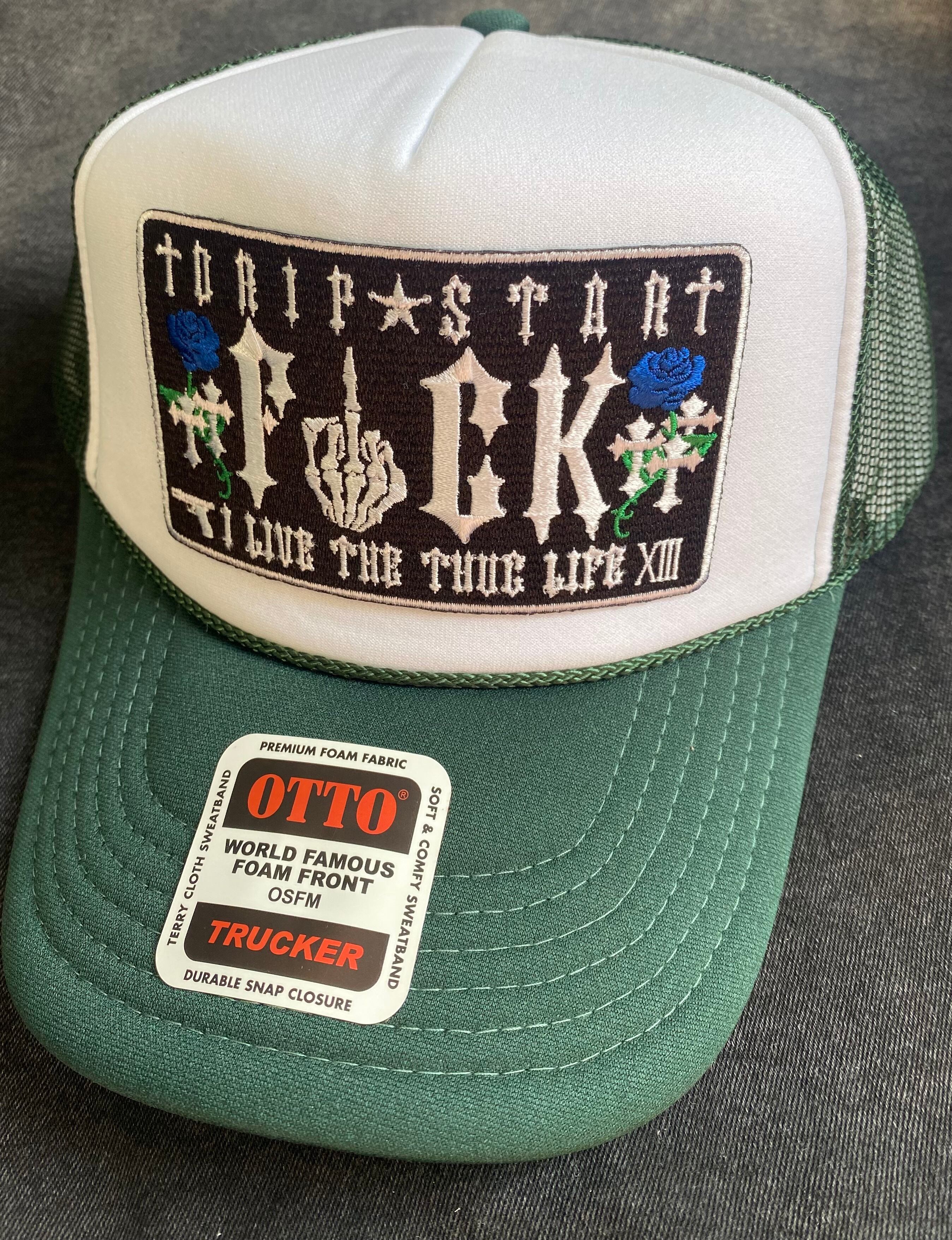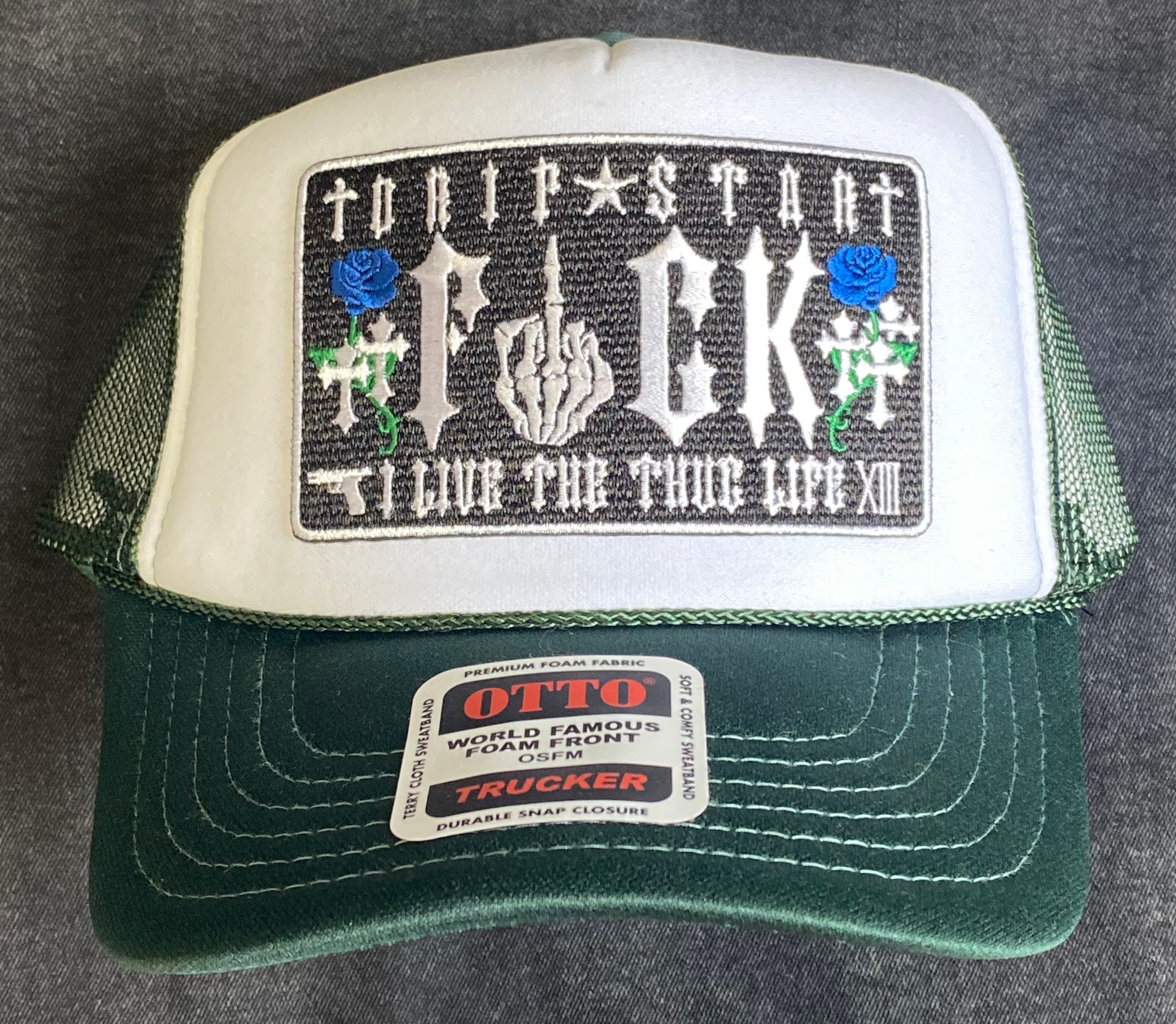 ✟DRIP⛧STAR™︎ "FUCK" Blue rose ver. Mesh cap WT/DGR メッシュキャップ uk drip us drip uk drill us drill trap boom bap street style ヒップホップ ストリート ダークグリーン 緑
